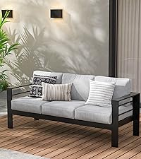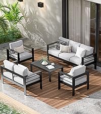 The outdoor patio furniture set is crafted from 100% firm aluminum that we chose for its sturdiness, and it's sure to stand up to rust, harsh sunshine, and windy rainstorms while offering a large weight capacity(300LBS per seat).
